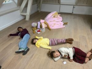 Van tevoren heeft de docent even gewaarschuwd, dat deze kamer op zolder best spannend kon zijn. Jeetje we waren inderdaad verrast, het was spannend, dat was juist leuk, we liepen door de zolder en we zagen ook nog een mevrouw met bijzondere tanden en een liggende mevrouw. Daar zijn we maar even naast gaan liggen. Het leek wel een parade van enge mensen. Ooo ja Driss zag nog een stuk bruin brood bij 1 persoon op zijn been. Waarom zou dat zijn: Driss kon vertellen dat de man er al zo ziek uit zag dat hij een bruin brood nodig heeft.
