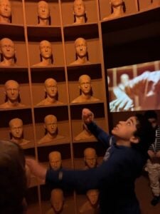 Kan het nog spannender? Ja hoor Levi van Veluw. Het was er donker, maar iedereen wilde het zien. Per 4 leerlingen zijn we naar binnen gegaan. Op de video zag je een man, dit was Levi zelf, die iedere keer een zelfportret beeldhouwde. Daarna kon je naar binnen en op de grond en op het plafond waren spiegels, het leek daardoor een oneindigheid, met al zijn zelfportretten.