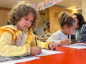 Yamuna Forzani, maakt werk met textiel, we probeerden de tekst te lezen, maar we zagen veel losse letters. Nu gingen we een wedstrijdje woorden spelen: kies 3 letters uit en maak er zoveel mogelijk woorden mee. Zelfs Tygo deed mee en kon de woorden ook heel mooi schrijven. Top!