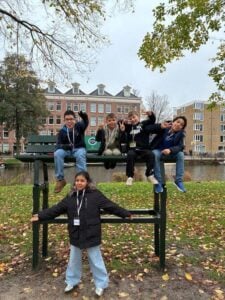 Dit was het vreemde beeld wat onder andere Anisa ook al buiten had gezien. Maar in het echt vonden wij het fantastisch, het was net echt! Larbi zag echte haren op zijn benen. Op de vraag hoe het zo schuin kon blijven staan, kon iemand vertellen dat dit kwam door een paal. De directeur stond om de hoek naar ons te kijken, hij vertelde ons dat dit klopt en dat er in de sokkel heel zwaar staal zat.
