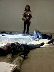 Bij Zoro Feigl gingen we even lekker liggen. We waren nu in de kelder, het was er donker en we zagen een soort sterrenhemel, de docent raakte je aan en je zei het eerste woord wat bij je op kwam. Het was een dwarreling van gedachtes in deze donkere kamer. In het midden weerspiegelde de bewegende spiegeltjes op ons gezicht en in de ruimte. Bij Zoro beweegt alles. Zo en nu gaan we weer naar boven in de villa voor een textielwerk.