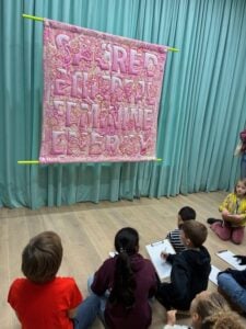 Yamuna Forzani, maakt werk met textiel, we probeerden de tekst te lezen, maar we zagen veel losse letters. Nu gingen we een wedstrijdje woorden spelen: kies 3 letters uit en maak er zoveel mogelijk woorden mee. Zelfs Tygo deed mee en kon de woorden ook heel mooi schrijven. Top!