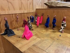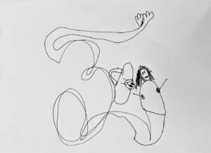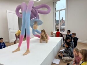 Wauw!!! Wat zien wij hier? Er werden 2 lichamen gezien, een vrouw en een speen en lange zuurstok draden, de mevrouw heeft lippenstift op. We liepen er een paar keer omheen en hebben haar daarna nagetekend. We vonden de kleuren ook erg mooi. Het is gemaakt door Vera Gulikers met de titel The mother (The Bobby in Me). Dus het klopte wat we zagen: 2 lichamen, als een vrouw zwanger is dat zijn er twee lichamen in één.