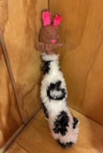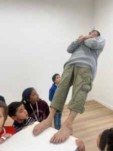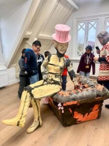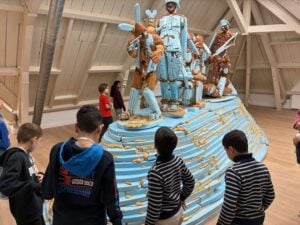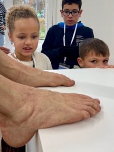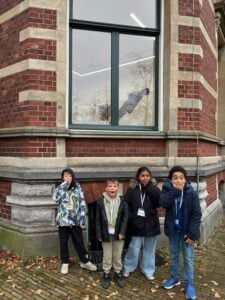 Dit was het vreemde beeld wat onder andere Anisa ook al buiten had gezien. Maar in het echt vonden wij het fantastisch, het was net echt! Larbi zag echte haren op zijn benen. Op de vraag hoe het zo schuin kon blijven staan, kon iemand vertellen dat dit kwam door een paal. De directeur stond om de hoek naar ons te kijken, hij vertelde ons dat dit klopt en dat er in de sokkel heel zwaar staal zat.