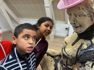 Van tevoren heeft de docent even gewaarschuwd, dat deze kamer op zolder best spannend kon zijn. Jeetje we waren inderdaad verrast, het was spannend, dat was juist leuk, we liepen door de zolder en we zagen ook nog een mevrouw met bijzondere tanden en een liggende mevrouw. Daar zijn we maar even naast gaan liggen. Het leek wel een parade van enge mensen. Ooo ja Driss zag nog een stuk bruin brood bij 1 persoon op zijn been. Waarom zou dat zijn: Driss kon vertellen dat de man er al zo ziek uit zag dat hij een bruin brood nodig heeft.