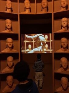 Kan het nog spannender? Ja hoor Levi van Veluw. Het was er donker, maar iedereen wilde het zien. Per 4 leerlingen zijn we naar binnen gegaan. Op de video zag je een man, dit was Levi zelf, die iedere keer een zelfportret beeldhouwde. Daarna kon je naar binnen en op de grond en op het plafond waren spiegels, het leek daardoor een oneindigheid, met al zijn zelfportretten.