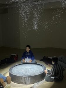 Bij Zoro Feigl gingen we even lekker liggen. We waren nu in de kelder, het was er donker en we zagen een soort sterrenhemel, de docent raakte je aan en je zei het eerste woord wat bij je op kwam. Het was een dwarreling van gedachtes in deze donkere kamer. In het midden weerspiegelde de bewegende spiegeltjes op ons gezicht en in de ruimte. Bij Zoro beweegt alles. Zo en nu gaan we weer naar boven in de villa voor een textielwerk.